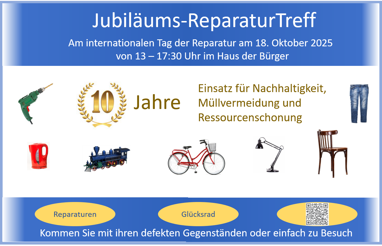 Zum 10-jährigen Jubiläum gab es einen besonderen ReparaturTreff. Neben dem üblichen Reparaturangebot hatten wir einen Fahrradexperten Vorort. Eingeladen waren diesmal auch Interessierte, die sich ein Bild machen wollten. Handwerklich Begabte konnten sich über eine Mitarbeit informieren. Am Glücksrad gab's praktische Kleinigkeiten für Bastler. In unserer Kaffeeecke wurde aus der Wartezeit eine Kaffeepause mit netten Gesprächen.
